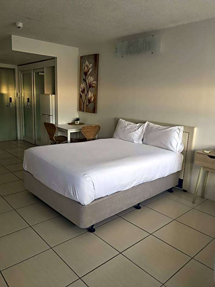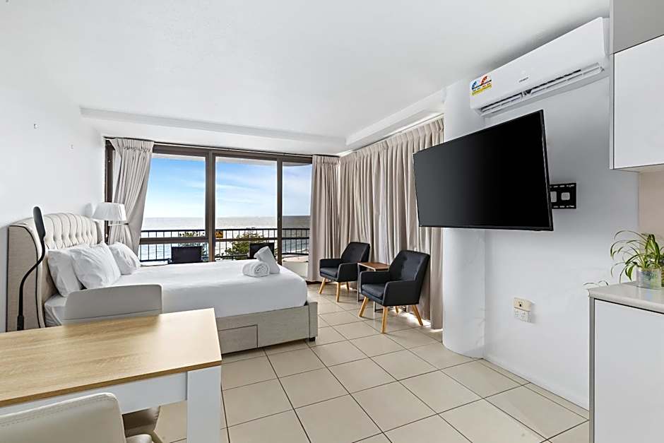 The double room's kitchenette, which features a refrigerator and a microwave, is available for cooking and storing food. The spacious double room provides air conditioning, a tea and coffee maker, a balcony with sea views as well as a private bathroom featuring a shower. The unit offers 1 bed. Apartments are individually styled and furnished and may differ from photos provided. Note that the photos are only indicative of the apartments. This room is located on level 1 so although you can see the ocean, this room does not have full uninterrupted ocean views. Breakfast is not available on Public Holidays.